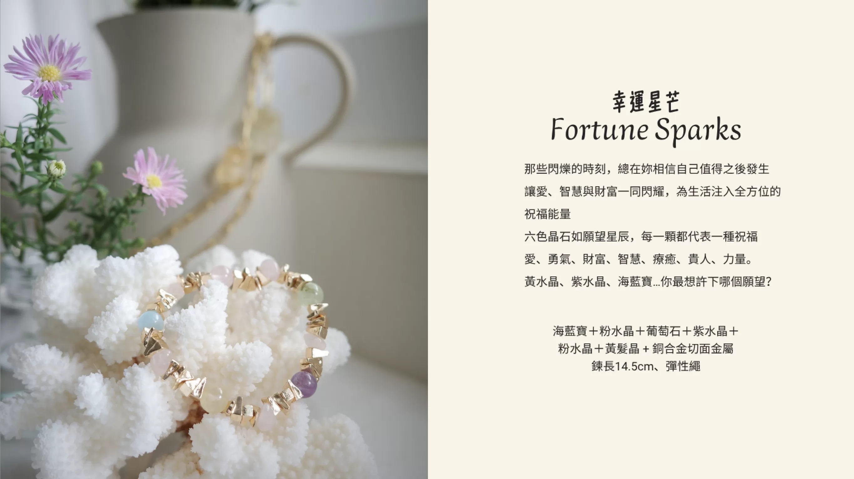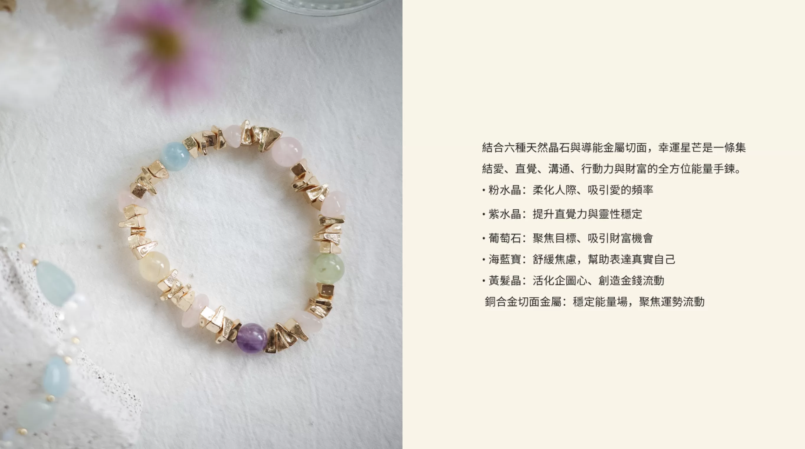 結合六種天然晶石與導能金屬切面,幸運星芒是一條集結愛、直覺、溝通、行動力與財富的全方位能量手鍊。