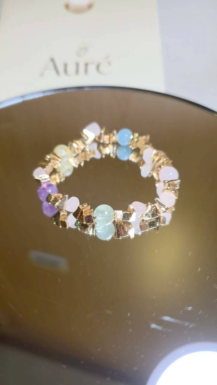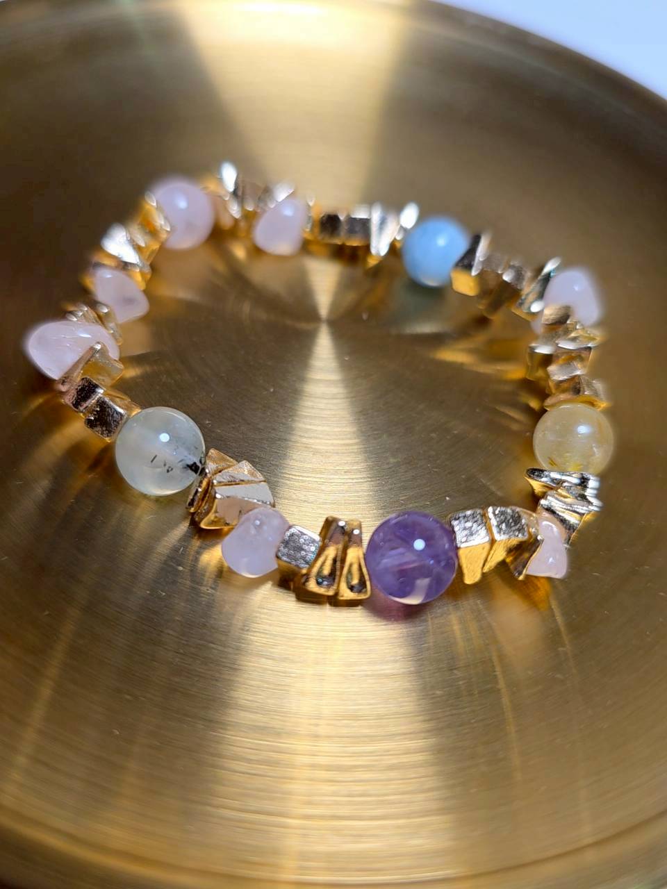 商品材質:海藍寶+粉水晶+葡萄石+紫水晶+粉水晶+黃髮晶 + 銅合金切面金屬